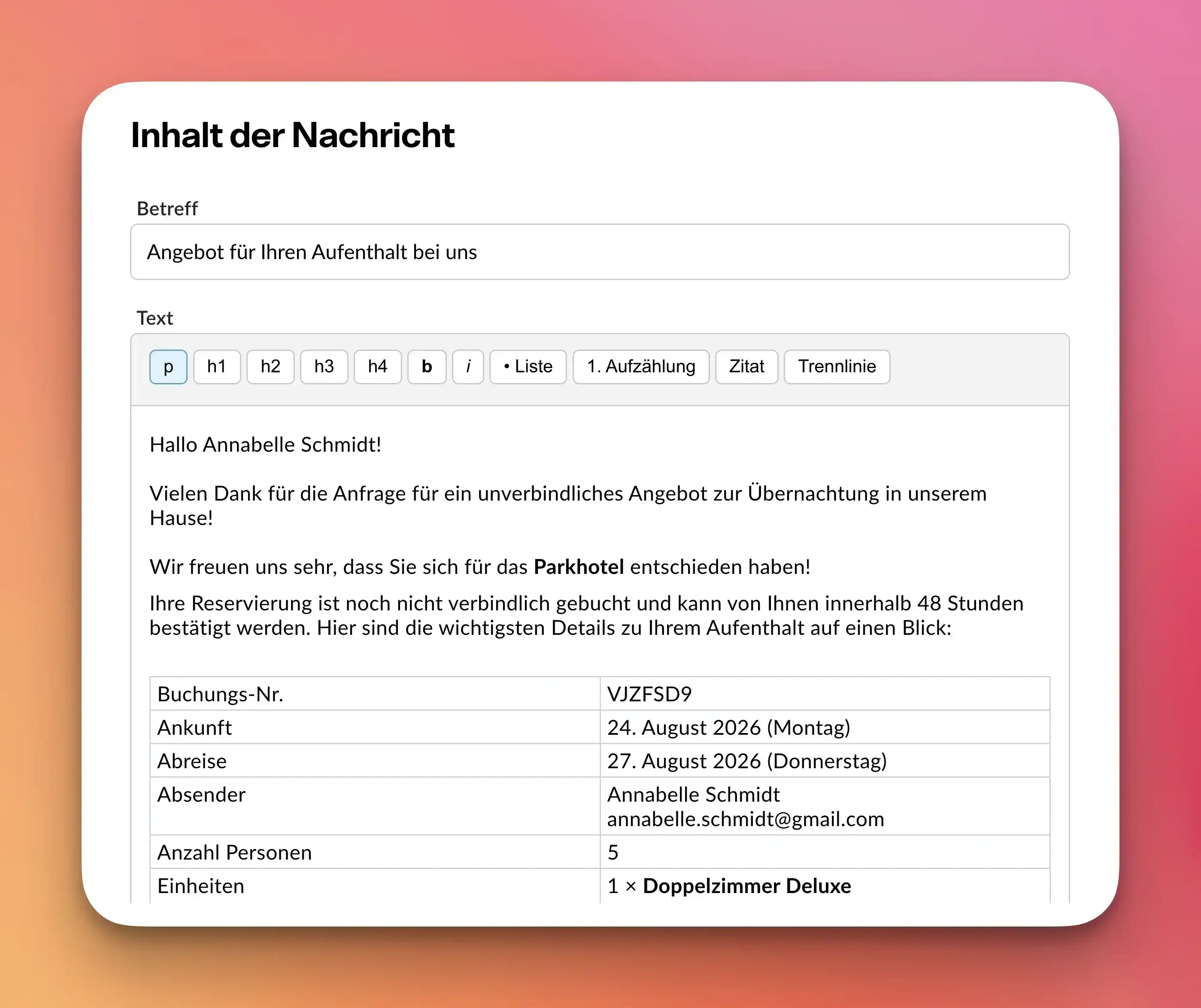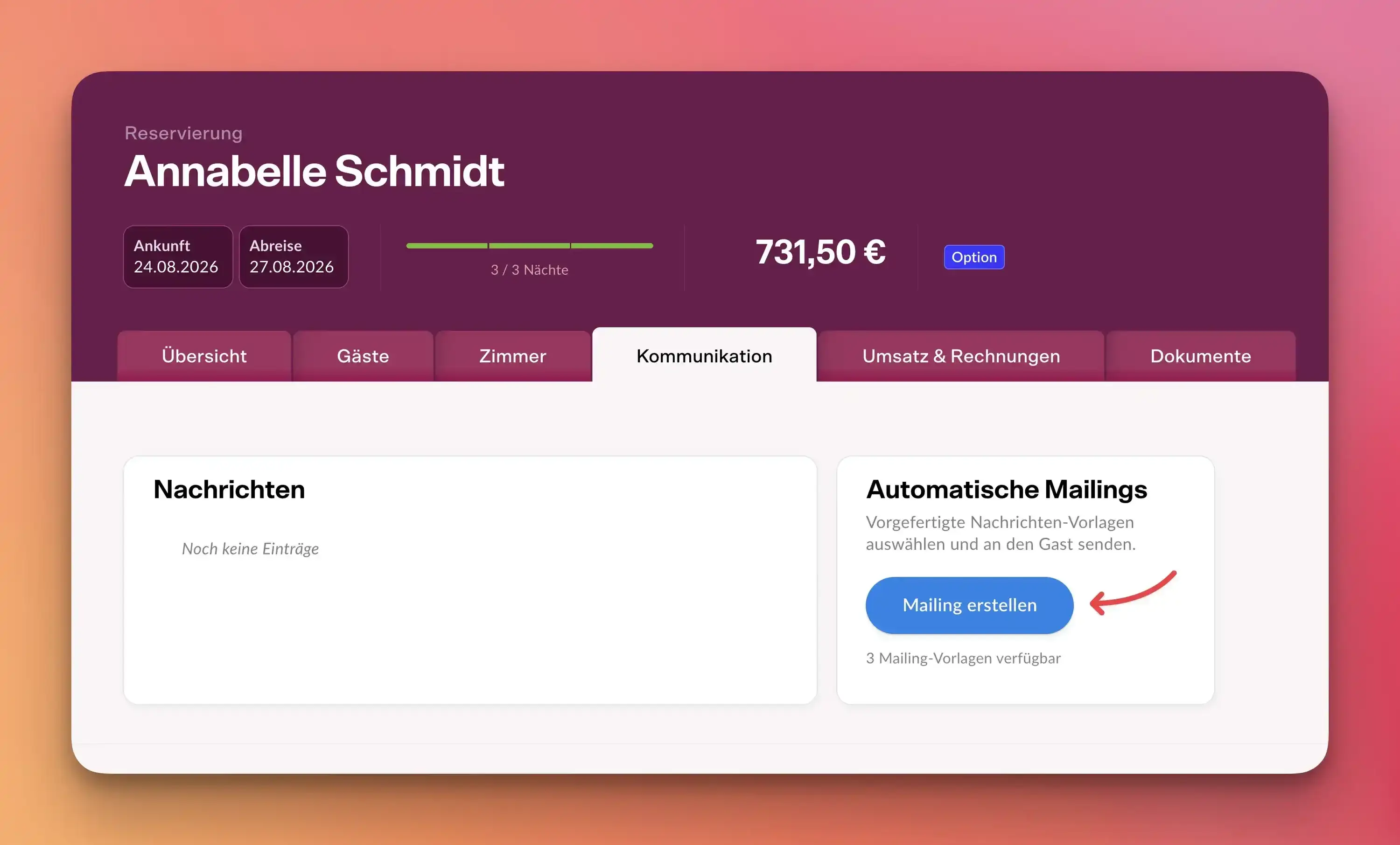 Nach der Einrichtung des passenden Mailings ist das Versenden eines passenden Angebots nunmehr eine sehr leichte und schnelle Angelegenheit. Die Gäste erhalten somit innerhalb weniger Minuten alle gewünschten Angaben und können das Hotel informieren, sobald das Angebot in eine feste Buchung übernommen werden soll.