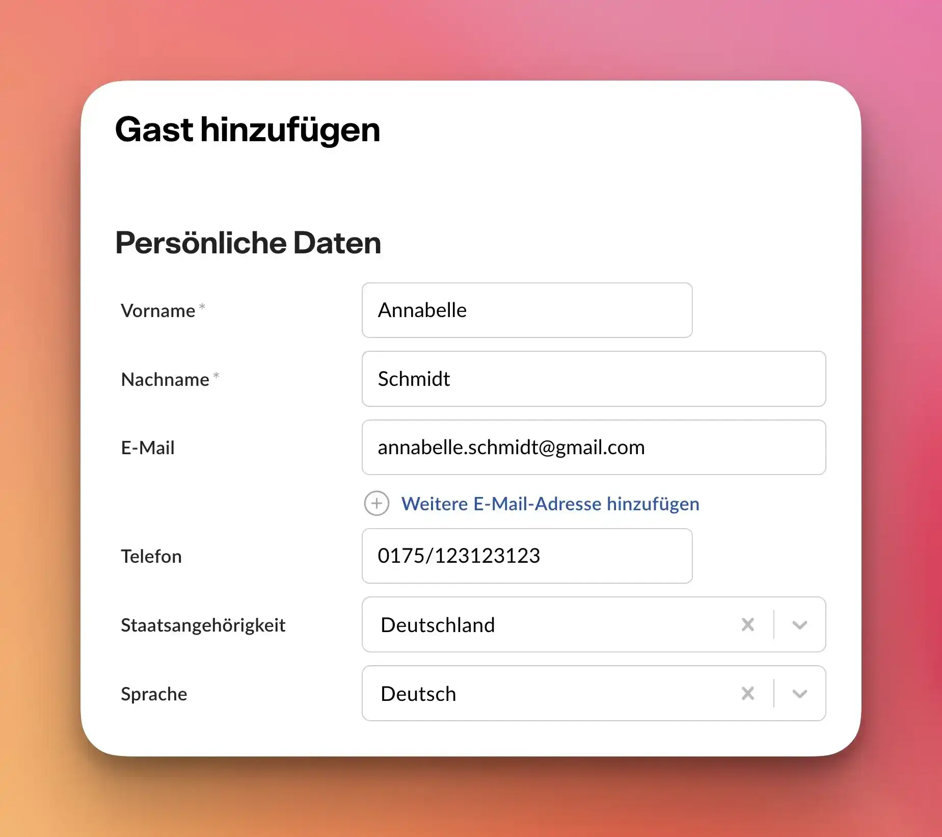 Zum festen Eintragen der neuen Reservierung öffnet sich der Buchungs-Assistent in einem neuen Fenster.  Fügen Sie dort einen neuen Gast in Ihre Gästekartei hinzu. Tragen Sie bereits die wichtigsten persönlichen Daten, wie Name, Telefonnummer und E-Mail-Adresse ein!