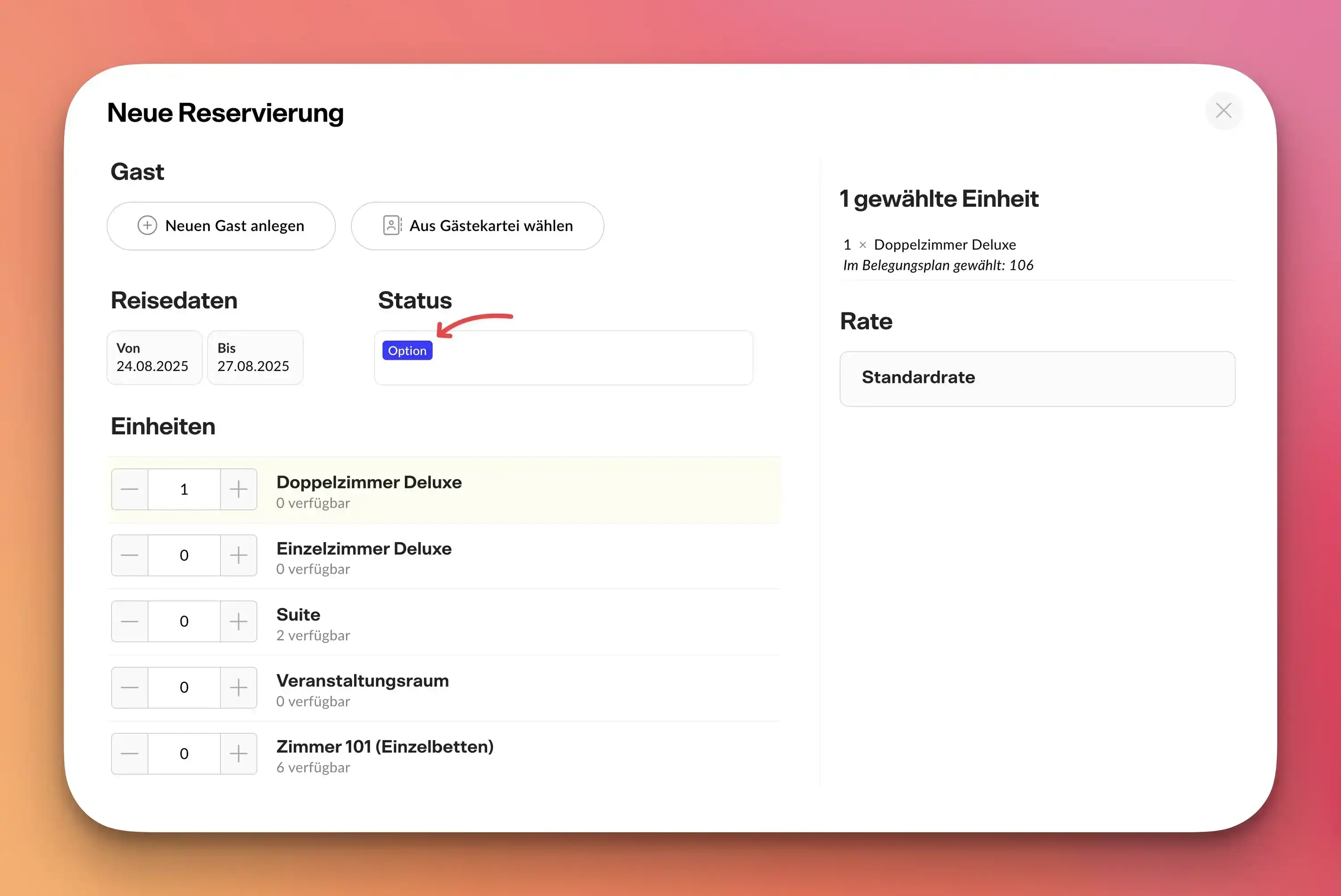 Möchten Sie die Option für den Gast allerdings fest eintragen und die Zimmer für andere Bucher blockieren, brauchen Sie diesen Status ("Option") nicht zu verwenden.