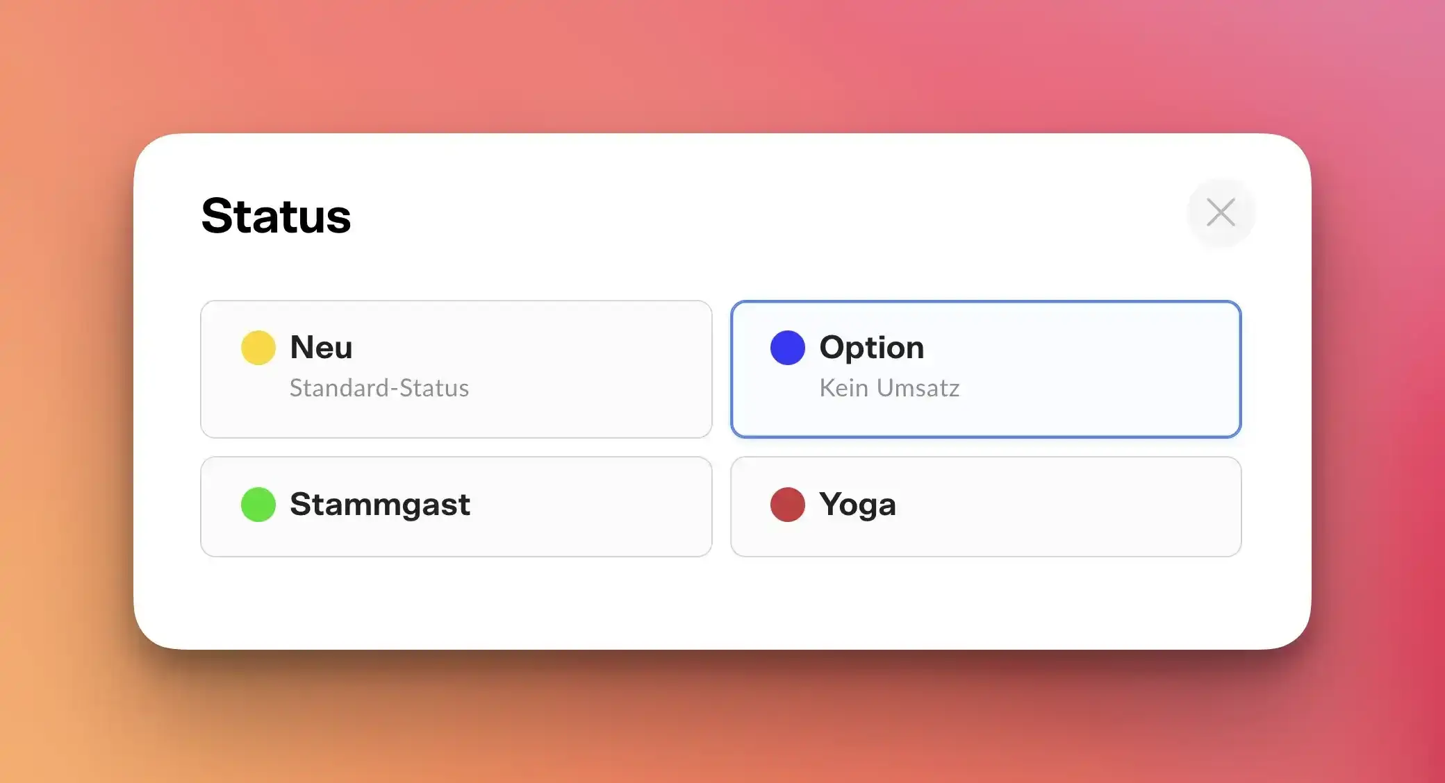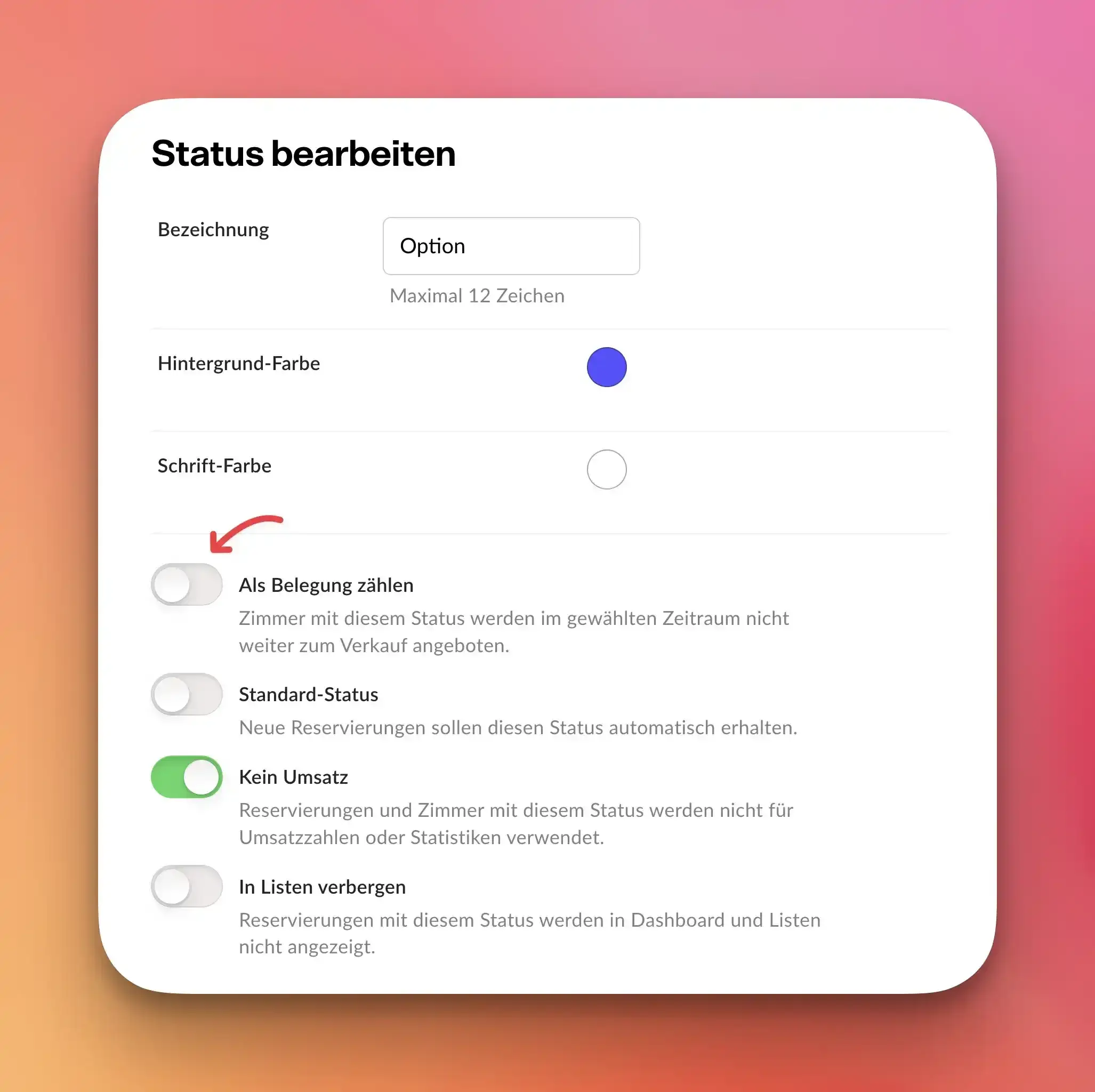 Die Buchung sollte einen Status „Option“ oder ähnlich erhalten. Dieser Status kann von Ihnen vorab in den Hotel-Einstellungen angelegt werden und sollte die Funktion "Kein Umsatz" haben sowie nicht als Belegung zählen.