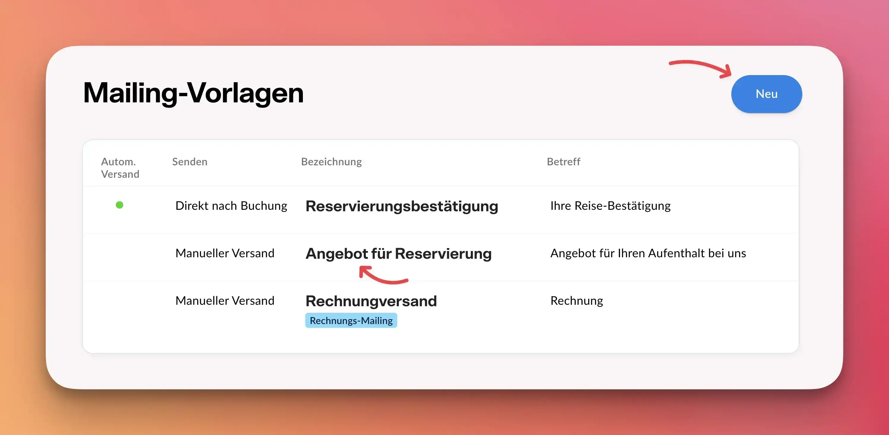 Erstellen Sie zuerst ein passendes Mailing. Dieses wird Ihren Gästen zugesendet, sobald ein Angebot verschickt werden soll. Sie finden die Mailing-Verwaltung im Menü Hotel—Mailings.