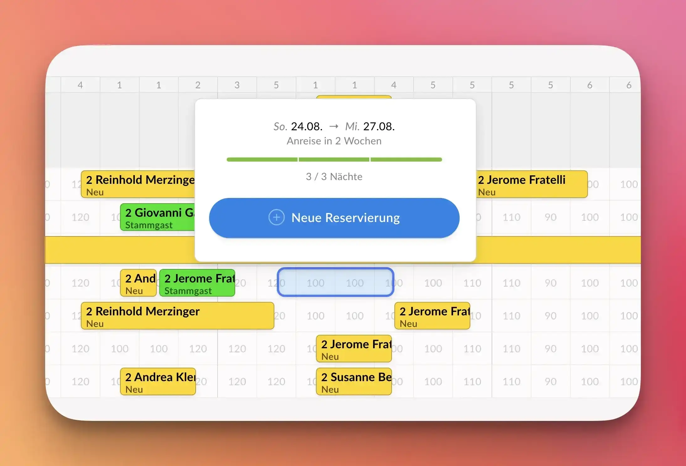 Sobald ein Gast ein Angebot erfragt legen Sie für die gewünschten Reisedaten eine Buchung im System an. Über den Belegungsplan oder über das „Reservierungen" Menü.