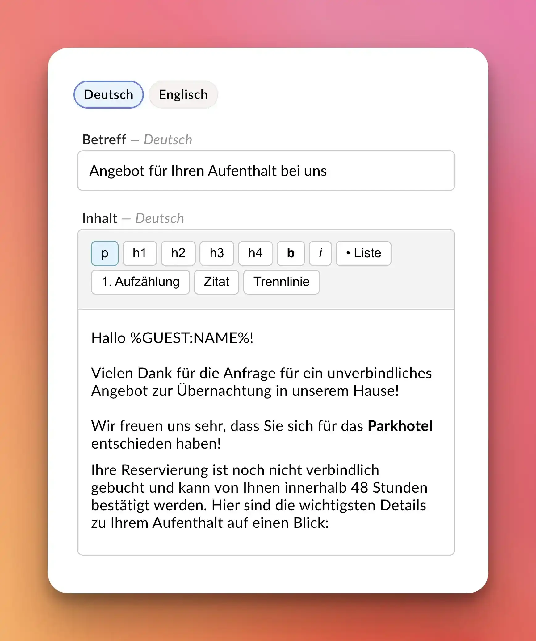 Alle Texte im Mailing-Assisten können auch direkt vor Versand noch von Ihnen geändert werden! Eine besonders praktische Möglichkeit für letzte Anpassungen oder persönliche Ergänzungen ("Wie soeben telefonisch besprochen" oder "Wir haben Ihre Wünsche für ein Zimmer mit Garten-Blick mit berücksichtigt").